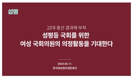 한국여성정치네트워크(아래 여성정치네트워크)는 11일 오후 ‘22대 총선에 부쳐’라는 성명을 통해 “성평등 국회를 위한 여성 국회의원의 의정활동을 기대한다”라며 이같이 강조했다. 여성정치네트워크는 “(윤석열 대통령은)취임 초반부터 정치 개혁 없이 단지 정권 교체에만 의의를 두며 국민 눈높이에 맞지 않는 국정 운영으로 일관했다”라고 지적하고 “국민에게 신뢰를 주지 못했고, 국민과 소통하지 않는, 국민의 소리에 귀 닫고 국민과 싸우는 대통령으로 비추기에 충분했다”라며 비판했다. 여성정치네트워크는 “더불어민주당은 무려 175석에 달하는 공룡 정당이 되었고, 게다가 태생이 같은 조국혁신당의 12석을 더하면 22대 국회에서 개헌 말고 하지 못할 입법이 없다고 해도 과언이 아니다”라며 “총선 과정에서도 노정된 이재명 당대표의 사법 리스크와 비도덕적 언행이 문제가 있었음에도 윤석열 정부에 대한 심판이 모든 이슈를 다 덮어버린 정치적 텐트가 되었다”라고 밝혔다. 여성정치네트워크는 “‘비명횡사’라는 반정치적 신조어가 현실이 되었듯 공천 과정에서부터 심각한 문제를 노정하였다. 천인공노할 여성에 대한 성적 비하 발언자 김준혁, 사기대출 논란으로 물의를 일으킨 양문석 등은 각계의 비판과 사퇴 요청에도 묵묵부답으로 일관했다”라며 “다양한 계층과 소수자의 목소리를 담아낼 정당이 없다”라고 강조했다. 여성정치네트워크는 “정책과 공약은 실종되고 양당 중심의 치졸한 정쟁만 난무한 선거였다. 총선이 정치 보복을 위한 정치적 도구가 되었다”라며 “십여 일간의 K-드라마를 지켜보는 국민들은 정작 최악을 피하고자 한 표를 투척해야 하는 상황에 자괴감을 느껴야 했다”라고 주장했다. 여성정치네트워크는 “국민은 진보정당마저 심판했다. 양당 중심의 기성정치에 맞서 ‘일하는 사람의 정당’을 만들어 낸 지 20년이 되었다”라며 “진보정당의 계보를 이어왔던 정의당은 국회의원 배지를 달던 가슴에 손을 얹고 성찰의 시간을 가져야 한다”라고 일갈했다. 여성정치네트워크는 “공룡 정당이 된 민주당은 여성들의 표심에 대해 응답해야 한다”라며 “성평등 국회를 위한 여성 국회의원의 의정활동을 기대한다”라고 밝혔다. 여성정치네트워크는 “22대 국회에서는 비례 의원에 이어 지역구 역시 ‘남녀 동수 공천’이 가능할 수 있도록 입법 활동해 주길 기대한다”라며 “여성과 남성이 공정하게 경쟁할 수 있는 당연한 권리다”라고 덧붙였다.