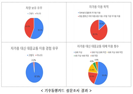 서울시민의 필수품으로 자리 잡은 기후동행카드의 두 달여간의 이용 현황과 성과를 서울시가 분석한 결과 이같이 나타났다. 기후동행카드는 서울시가 전국 최초로 선보인 무제한 대중교통 통합정기권으로, 서울 지하철과 심야버스(올빼미버스)를 포함한 서울시 면허 시내·마을버스, 공공자전거 따릉이를 무제한으로 탈 수 있어 인류의 시대적 과제인 기후 위기 대응은 물론 시민들의 실질적인 경제적 부담까지 덜어 준 것으로 확인됐다. ‘기후동행카드’ 사용으로 절감한 교통비는 1인 월평균 약 3만원에 달하는 것으로 나타났다. 연령대별로는 ▲20대 2만 9천원 ▲30대 2만 7천원 ▲40대 2만 8천 원 ▲50대 3만 1천원 등이다. 서울시는 지난 3월 8일~11일, ‘기후동행카드’ 이용자 2,823명을 대상으로 설문조사를 실시한 결과, 이용자의 4%, 127명이 ‘상시 이용하던 승용차 대신 대중교통을 많이(월 20회 이상) 이용했다’고 응답했다. 전체 응답자(2,823명) 중 56.2%에 달하는 1,586명은 승용차를 보유하고 있었는데, 이 중 230명(14.5%)은 평일 출퇴근 등 승용차 상시이용자였다. 이들 승용차 상시이용자 중 225명(97.8%)는 기후동행카드 구매 후 승용차 대신 대중교통을 이용한 경험이 있다고 답했고 이 중 127명(56.4%)가 월 20회 이상 승용차 대신 대중교통을 이용했다고 답했다. 서울시는 ‘기후동행카드’ 평일 사용자가 평균 50만 명임을 고려했을 때 4%에 해당하는 약 2만 명이 월 20회 이상 승용차 대신 대중교통을 이용한 것으로 추정할 수 있다고 덧붙였다. 일 평균 2만 명이 승용차 대신 대중교통을 이용했다면 승용차 운행량도 하루 1만 1천대 가량 줄어들었다는 계산이 나온다. 일반적으로 승용차 1대에서 발생하는 연간 온실가스 발생량이 1.96톤임을 고려했을 때 ‘기후동행카드’를 통해 두 달 만에 약 3천6백 톤의 온실가스를 감축한 셈이다. 이는 수령 20년산 가로수(낙엽송, 편백, 상수리나무 등) 약 43만 그루의 온실가스 감축 효과와 동일하다. 서울시는 이번 설문조사를 시작으로 향후 서비스 및 제도 변화에 따라 이용 패턴 또한 변화할 것으로 보고 추후 정확한 효과성 분석 등을 위해 서울연구원과 추가 설문조사를 추진할 계획이라고 밝혔다. 기후동행카드 구매 연령대는 ▲20대 29% ▲30대 28% ▲40대 15% ▲50대 18% ▲60대 9% 였고, 주이용층은 아무래도 출퇴근 등이 많은 20~30대가 많았다. ‘기후동행카드’의 하루 평균 이용 횟수는 3.4회였다. 일반 교통카드 2.5회에 비해 0.9회 많았는데 환승 시간 등에 구애 없이 무제한으로 편리하게 이용할 수 있다는 점 때문으로 사용량이 많은 것으로 시는 분석했다. 한편 서울시는 ‘기후동행카드’와 문화·공원시설 입장료 할인 연계, 관광객을 위한 단기권 도입, 인접 지자체로의 서비스 범위 확대 등 다양한 지원 및 제도 개선을 앞두고 있다.