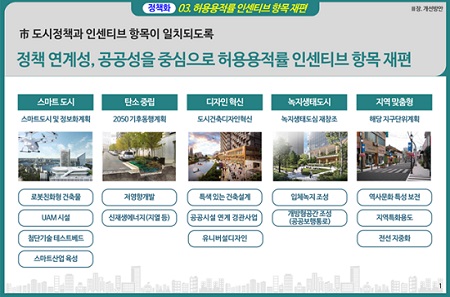 더불어 지역 상황과 여건 변화를 반영하지 않고 일률적으로 적용해 온 용적률 인센티브 항목이 미래 도시공간 수요와 공공성을 중심으로 재편한다.