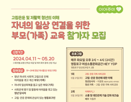 영등포구(구청장 최호권)가 “지역 내 고립·은둔 청년들의 신속한 일상 회복과 건강한 사회 안착을 응원하기 위해 청년 당사자들과 부모(가족)를 대상으로 교육 프로그램 ‘이어주미’ 참가자를 모집한다”고 4월 26일 밝혔다. 상반기에는 고립·은둔 청년에 대해 알아가고 이해하기 위한 교육들로, 총 4회차로 구성되어 있다. 교육 주제는 ▲고립·은둔 극복 당사자 사례 공유 ▲ 소통 및 대인관계 기술 강화 ▲자기 이해 및 성장을 위한 각자의 역할 찾기 ▲진로 설계 및 탐구 등으로, 부모와 청년 당사자를 대상으로 강의가 진행된다. 또한, 상반기 프로그램에서는 이동주(배우), 이주훈(뮤지컬배우), 박성은(단델리온 커리어) 등이 강사로 참여한다. 특히, 고립·은둔 경험이 있는 청년 당사자가 강사로 직접 나서 본인의 은둔 경험과 극복 과정 등의 이야기를 가감 없이 들려줄 예정이다. 이번 상반기 참여자 인원은 매 회차 20명으로, 선착순 마감된다. 모집 기한은 오는 5월 20일 오후 6시까지이며, 정보무늬(QR코드)를 통해 온라인으로 신청할 수 있다. 지역 내에 거주하거나 생활권을 둔 구민이라면 누구나 참여할수 있다. 교육은 5월 21일부터 4주간 매주 화요일에 ‘영등포구 여성소통문화공간 HEY YDP’에서 진행된다. 하반기에는 자녀의 고립·은둔의 상황을 정확히 마주하고 이를 극복하기 위한 프로그램들로 구성되며, 총 6회차로 나누어 진행된다. 특히, 연기 기반의 ‘예술 치유 워크숍’을 통해 각자의 상황을 진솔하게 표현하고 서로를 이해하는 시간을 갖는다. 하반기 프로그램의 구성과 내용, 모집 인원 및 기간 등 자세한 사항은 추후 공개될 예정이다. 이어주미란 ‘이어주다’와 ‘미래’를 조합한 것으로, 청년 당사자들의 주변 관계인들이 힘을 모아 청년과 미래를 이어주자는 의미를 담고 있다. 교육 대상을 청년 당사자부터 부모와 가족으로 확장하여 주변인들과의 관계 형성과 사회 환경의 변화를 함께 지원하는 것에 의의가 있다. 청
