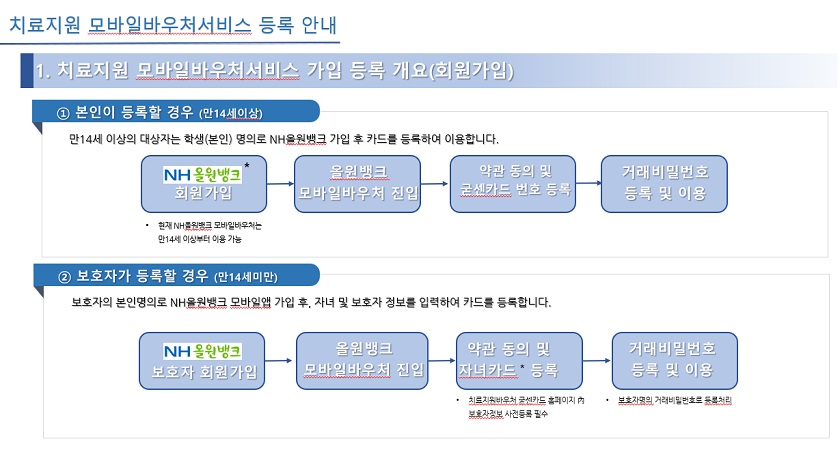 서비스 이용 대상은 NH올원뱅크 가입고객이며, 굳센카드 이용자로 14세 이상 학생(본인) 또는 학생 보호자 명의로 가입 등록해 사용할 수 있다. 단, 굳센카드 1개당 1명만 등록하여 이용할 수 있어 14세 미만인 학생은 보호자 명의로만 가입 등록할 수 있고, 14세 이상인 학생은 보호자 중 스마트폰 소지여부 등에 따라 선택하여 가입 이용할 수 있다. 서비스 이용 방법은 NH올원뱅크 회원가입 후, 학생 본인 또는 보호자가 학생 명의의 굳센카드 카드번호와 거래비밀번호 등을 입력하면 등록할 수 있다. 등록이 완료되면 스마트폰으로 치료지원 제공기관이 제시한 QR코드(제로페이QR)를 스캔하여 결제하는 방식이다. 조희연 서울시교육감은 “이번 치료지원 모바일바우처서비스 시행으로 간편하고 효율적인 결제 및 조회 기능을 제공할 수 있어 특수교육대상자의 편의성이 한층 증대될 것으로 기대한다.”면서 “향후에도 지속해서 특수교육관련서비스의 질적 향상을 통해 교육 만족도가 높아질 수 있도록 노력해 나갈 것”이라고 밝혔다.