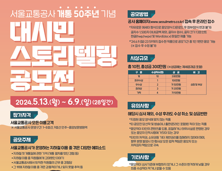 서울교통공사(아래 공사)는 지하철 개통 50주년을 맞아 스토리텔링 공모전을 개최한다.