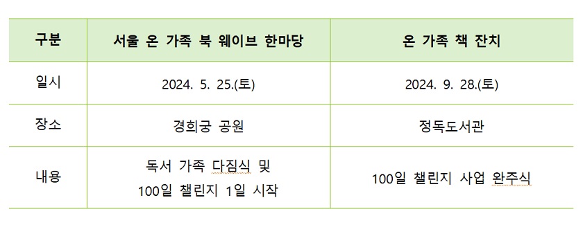 또한 5월 25일부터 9월 7일까지 서울특별시교육청 22개 도서관·평생학습관에서는 ‘온 가족 북웨이브 100일 챌린지’를 운영한다. 25일 경희궁 공원에서 열리는 ‘온 가족 북웨이브 한마당 : 파도파도(WaveWave) 재미있는 책읽기’에서 독서 가족 선언식과 함께 시작하는 북웨이브 100일 챌린지는, 22개 교육청 도서관·평생학습관의 누리집이나 서울특별시 통합도서관 누리집을 통해 온라인으로 서울 가족과 희망 학교는 누구나 신청할 수 있다. 조희연 서울시교육감은 “북웨이브 캠페인이 서울 학생뿐 아니라 모든 시민이 책과 친숙해지고, 평생 독서하는 습관을 기르는 데 중요한 계기가 될 것이다”라며 “학생들의 문해력 향상과 학업 성취뿐만 아니라 창의력과 비판적 사고 능력 향상에도 이 캠페인이 큰 도움이 될 것이다”라고 말했다.