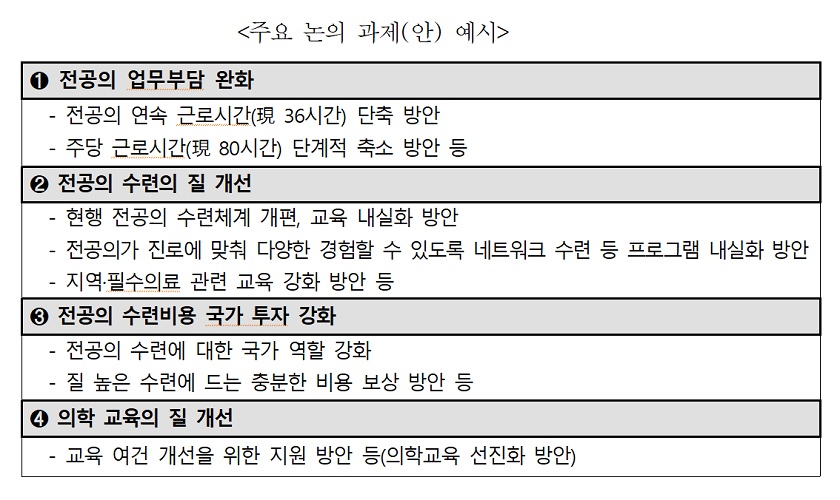 정부는 분야별 의료 개혁 과제를 속도감 있게 구체화하기 위해 의료 개혁특별위원회 산하에 ▲의료인력 전문위원회 ▲전달체계·지역의료 전문위원회 ▲필수 의료·공정 보상 전문위원회, ▲의료사고 안전망 전문위원회를 두고 있다. 이날 제1차 회의에서는 의료 개혁특위에서 논의한 사항과 함께 의료 개혁 방향 및 논의 과제를 공유하며 의료 개혁의 공감대를 형성하고 향후 전문위원회에서 집중적인 논의가 필요한 과제에 대해 의견을 나누었다. 회의 결과 ▲전공의 업무 부담 완화 ▲전공의 수련의 질 개선 ▲전공의 수련비용 국가투자 강화 ▲의학 교육의 질 개선 등 과제에 대해 전문위원회에서 중점적으로 검토·논의하기로 했다.