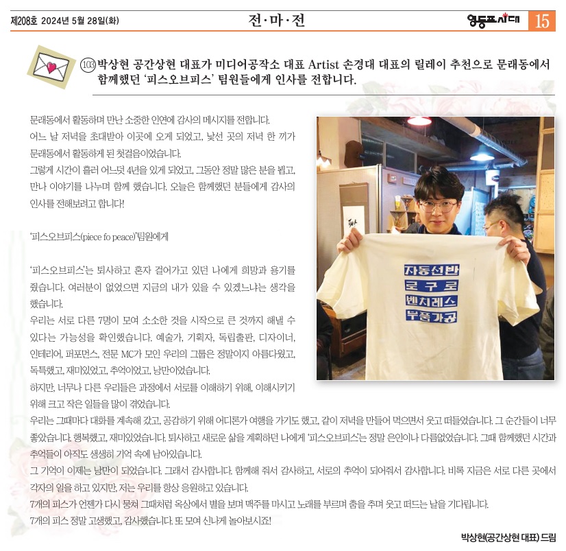 박상현 공간상현 대표가 미디어공작소 대표 Artist 손경대 대표의 릴레이 추천으로 문래동에서 함께했던 ‘피스오브피스’ 팀원들에게 인사를 전합니다.