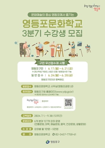 6월 17일부터 21일까지 구민 우선 접수 기간이며, 6월 24일부터 28일까지는 일반접수 기간으로 우선 접수 기간을 놓친 구민을 포함해 누구나 신청할 수 있다. 특히 영등포구는 “보다 많은 구민에게 배움의 기회를 제공하기 위해 현재 주민등록지 상 거주지가 영등포구는 아니지만, 지역 내에 있는 학교와 회사 등을 다니는 학생, 직장인, 사업자 등도 포함하여 우선 접수 기간에 신청할 수 있도록 했다”라고 밝혔다. 단, 구민 우선 접수 기간에는 영등포 문화학교로 ‘방문 접수’만 가능하며, 선착순으로 진행된다. 이외 일반 접수 기간에는 구청 누리집 ‘통합예약 서비스’를 통한 온라인 접수 또는 본인 명의 휴대전화와 신분증 등을 지참해 영등포 문화학교로 방문 신청 모두 할 수 있다. 이번 3분기 문화강좌는 7월 1일부터 9월 30일까지 진행되며, ▲전통문화 강좌 20개 ▲어학강좌 13개 ▲예술문화강좌 28개 ▲음악 강좌 33개 ▲건강문화강좌 20개 ▲생활문화강좌 13개로, 총 6개 분야 127개로 구성된다. 또한 영등포 문화학교는 이번 분기에 직장인과 어린이와 청소년들의 생활패턴을 고려하여 평일 야간 프로그램과 토요 프로그램을 확대 운영할 계획이다. ▲평일 야간 프로그램에는 태극권, 색소폰, 명상 기공, 하와이훌라 등 4개 강좌를 운영하며, ▲토요 프로그램에는 어린이 한글서예, 토요 드럼반, 토요 웰빙 댄스, 청소년 타로스쿨, 청소년 드럼반, K-POP 방송 댄스, 어린이 한국무용 등 7개 강좌가 준비되어 있다. 수강료는 강좌별 월 1~5만 원대로, 수강 신청 후 구청 계좌로 이체하거나 영등포 문화학교 사무실을 방문해 카드 결제를 하면 된다. 기초생활수급자, 등록장애인, 국가유공자는 관련 증빙서류와 신분증 지참 시 50%의 수강료 할인 혜택을 받을 수 있다. 최호권 영등포구청장은 “영등포구는 서울시 유일 법정 문화도시로서 1년 365일 문화를 만들고 향유할 수 있는 공공 문화 거점으로 힘차게 나아가고 있다.”라며 “앞으로도 영등포 문화학교를 통해 구민들이 일상에서 손쉽게 문화를 접하며 풍요로운 삶을 누리실 수 있도록 운영에 최선을 다하겠다.”라고 전했다.