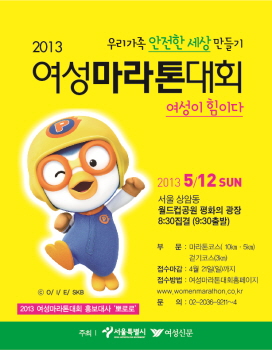 어린이들의 대통령으로 통하는 뽀로로는 순수 토종 캐릭터의 맥을 이어 나가는 글로벌 인기캐릭터다. 뽀로로가 ‘우리가족 안전한 세상만들기’라는 슬로건 아래 열리는 ‘여성마라톤대회’를 응원한다. 뽀로로는 <여성신문>과의 가상인터뷰(3월20일자 기사 ‘여성마라톤 홍보대사 뽀로로 “달리기 자신 있어요”’요 참조)에서 “달리기에 자신이 있다. 새로운 친구들과 함께 달릴 수 있어 기쁘다”며 여성마라톤에 대한 기대감을 숨기지 않았다. 행사 당일에는 뽀로로가 현장을 찾아 어린이 참가자들을 응원한다. ‘뽀로로 포토타임’, ‘뽀로로와 함께하는 어린이 에어 바운스’ 등 마라톤대회에 참여하는 어린이들을 위한 이벤트를 통해 어린이 참가자들과 함께 한다. 2013 여성마라톤대회는 여성신문과 서울시가 공동주최하며, 5월 12일(일) 상암동 월드컵 공원 평화의 광장에서 개최된다. 참가자 전원에게는 스포츠 브랜드 훼르자의 고급 스포츠 티셔츠를 제공하며, 완주자에게는 완주매달과 체력보충을 위한 간식도 함께 제공된다. 또 추첨을 통해 푸짐한 경품을 제공한다. 홈페이지 http://www.womenmarathon.co.kr/에서 4월 21일(일)까지 접수 가능하다. (문의 : 홈페이지 또는 사무국 Tel. 02-2036-9211~14)