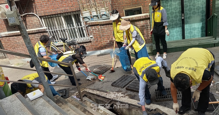 도림동 자원봉사자와 주민자치위원 그리고 주민센터(동장 김동희) 직원 등 30여 명이 6월 24일 오전 도림동 지역 일대 빗물받이 청소를 시행하고 있다.