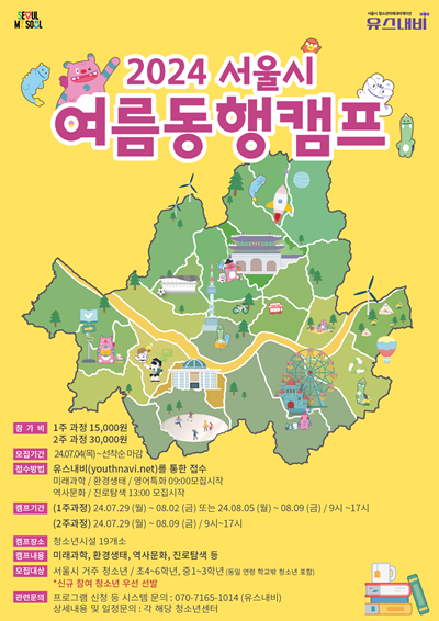 여름방학을 맞아 돌아온 “2024 서울시 청소년 동행 캠프”는 서울시립청소년시설 19개소를 통해 청소년의 적성·진로 탐색 및 건강한 미래 성장을 돕기 위해 270여 개에 달하는 다양한 테마의 활동 및 체험프로그램 등을 운영된다. 또한 방학 기간 중 자녀 돌봄이 막막했던 맞벌이 가정의 부담을 완화하기 위해 양질의 교육, 체험, 급식 등을 통합 지원한다. 서울시 청소년 동행 캠프는 2022년 여름에 시범 운영을 시작으로 총 4회 진행됐다. 2024년 여름방학, 5회 차를 맞는 서울시 청소년 동행 캠프는 그간 2,000명이 넘는 서울 청소년이 참여해 커다란 호응 속에 함께 방학을 즐겼다. 서울시는 청소년의 욕구를 충족하고 적극적인 참여를 끌어내기 위해 청소년의 관심사에 맞춰 ▲미래과학 ▲환경생태 ▲진로탐색 ▲역사문화 ▲영어 등 분야별 프로그램을 마련해 다채로운 경험을 제공한다고 설명했다. 또한 여름방학의 특성을 살림 워터파크 체험, 여름 캠프 활동 등 또래 친구들과 함께 즐길 수 있는 체험활동도 이루어질 예정이다. 특히, 방학을 맞은 청소년들의 진로에 대한 막연함과 고민을 해결하도록 효과적으로 돕기 위해 진로 탐색 테마를 강화하여 운영하는 한편, 단체활동을 통한 청소년의 관계 역량 강화를 위해 숙박형 캠프 프로그램도 진행한다. 이번 캠프는 2024년 7월 29일(월)부터 8월 9일(금)까지 2주간 서울시내 시립청소년시설 19개소(청소년센터 16개소, 미래진로센터 2개소, 음악센터 1개소)에서 1~2주간 진행되며, 최종 성과 공유회, 발표회, 전시회 등으로 마무리할 계획이다. 캠프 참가비는 1인당 3만 원(1주 과정은 15,000원)이며, 4학년 이상 초등학생과 중학생(만 10세 이상~만 15세 이하) 총 440명을 모집한다. 서울시는 다양한 교육 체험 기회에 있어서 소득계층 간 격차 완화를 위해 취약계층 청소년을 우선 선발할 예정이다. 참가자 모집은 7월 4일(목)부터 청소년종합정보플랫폼 ‘유스내비’를 통해 선착순으로 진행한다. Play스토어(안드로이드) 또는 앱 스토어(iOS)에서 ‘유스내비’ 검색하거나, 포털사이트에서 ‘유스내비’ 검색해 접속해 신청하면 된다. 구종원 서울시 평생교육국장은 “청소년들이 새로운 친구들을 만나고 즐겁게 활동하면서 함께 성장하고 배우는 뜻깊은 경험이 되기를 바란다”며, “서울시는 시립청소년시설을 통해 안전하고 다양한 청소년활동 프로그램을 제공하고 있으니 가까운 시립청소년센터를 많이 찾아 주시기 바란다”고 말했다.
