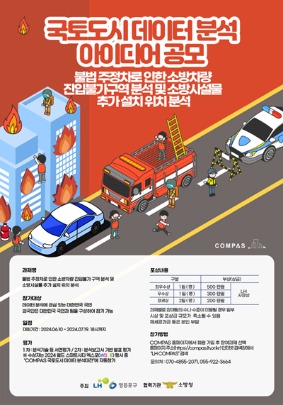 ‘COMPAS 데이터 분석 지원 사업’은 한국토지주택공사가 운영하는 플랫폼에 공유된 데이터를 기반으로 도시문제 해결을 지원하는 사업이다. 영등포구는 이번 사업에서 ‘불법 주정차로 인한 소방차 진입 불가 구역 및 소방시설물 추가 설치 위치 분석’을 주제로 참여해 공모에 선정됐다. 해당 과제는 관내 화재 취약지역 및 소방차 진입이 어려운 구역을 분석하고 취약지역에 대한 소방시설물 설치 위치를 도출하는 것으로, 소방차 진입의 골든타임을 지키고 신속한 화재 진압 지원을 목표로 한다. 현재 ‘COMPAS’에는 ▲재난·안전, ▲환경, ▲교통, ▲주거·복지 등 공모에 선정된 다양한 분야의 도시문제 및 관련 데이터 등이 공유되어 있다. 데이터 분석에 관심 있는 시민과 기관 등은 자유롭게 참여해 구체화한 도시문제의 해결을 위한 최적화된 데이터 모델을 제시할 수 있으며, 선정된 우수한 아이디어는 지자체 정책에 반영된다. 참여 방법은 한국토지주택공사(LH)의 ‘COMPAS’ 누리집을 통해 참여할 수 있으며, 데이터 분석에 관심 있는 개인 또는 5인 이하로 구성된 팀이라면 누구나 참여할 수 있다. 참여 기한은 오는 7월 19일까지이며 한국토지주택공사(LH)는 참가자들의 우수한 데이터 분석 결과를 전문적이고 공정한 심사를 통해 총 4개의 팀을 선정하여, 소정의 상금을 수여할 예정이다. 최호권 영등포구청장은 “이번 과제에서 도출된 자료들을 통해 구의 재난 대응 역량을 강화하는 소중한 기회가 되길 바란다.”라며 “앞으로도 안전하고 살기 좋은 영등포구를 만들기 위해 다양한 시민 참여형 사업들을 발굴해 나가겠다.”라고 밝혔다.