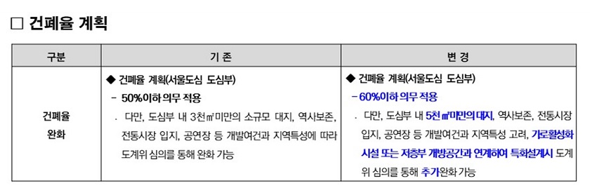 그 주요 내용으로는 ▲개방형 녹지 개념 재정립 및 기준 변경을 통한 실효성 있는 녹지공간 조성 유도 ▲지역 필요 시설 유도 및 공공성 확보 등을 위해 용적률 인센티브 계획 조정 ▲저층부 개방 공간 유도, 가로 활성화 용도 도입 등을 위해 건폐율 완화 ▲서울 도심 도심부의 합리적 높이 계획 기준 설정 ▲지구단위계획구역 상 특별계획구역도 정비 예정 구역 의제가 가능하게 한 것 등이다.