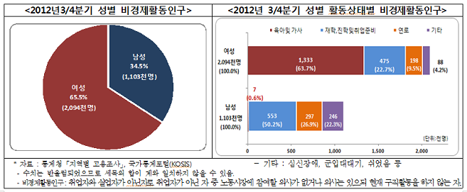 서울시가 분석한 통계에 따르면 지난 해 서울의 55세 이상 취업자는 95만 6천명으로 15~29세 취업자인 90만 3천명의 청년층 보다 많았다. 이는 '89년 통계작성이래 처음으로 89년에는 15~29세 취업자 비중이 35.9%로 높았으나 '12년 17.9%로 줄어든 반면, '89년 6.6%에 불과하던 55세 이상 취업자 비중은 '12년 19.0%로 3배나 증가한 것이다. 이러한 연령별 취업구조의 변화 원인으로 “청년층의 인구감소 및 학업기간 연장, 눈높이에 맞는 일자리를 찾기 위한 취업준비기간 증가 등으로 청년층이 노동시장에 진입하는 시기가 늦어지는 한편, 중고령자의 취업증가 및 취업현장에 저출산 고령화 현상이 영향을 미치고 있기 때문”으로 분석된다. 또한 대학 진학률이 높아지면서 취업자의 주 학력층이 '06년부터 대학졸업이상으로 바뀌었으며,'12년 취업자의 절반이 대졸이상인 것으로 나타났다. '02년 전체 취업자 중 44.8%를 차지하던 고졸 취업자 비중은 '12년 37.0%로 감소한 반면, 대졸이상은 '02년 34.1%에서 '12년 49.4%로 증가한 것으로 나타났다. 2012년 3/4분기 지역별 고용조사에 따르면, 서울 15세이상 비경제활동인구는 319만7천명이고, 이중 여성이 65.5%(209만4천명)를 차지하여 남성 비경제활동인구(110만3천명)의 거의 2배 수준이다.