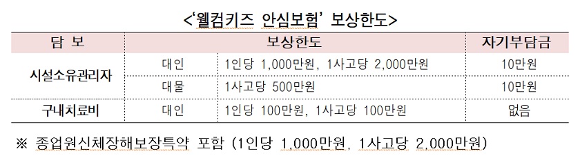서울시는 저출생 극복을 위한 ‘탄생 응원 서울 프로젝트’의 하나로, 식당이나 카페에서 안전사고가 발생했을 때 법률상 배상책임, 치료비 등을 1사고당 최대 2천만 원까지 보장받을 수 있는 ‘웰컴키즈 안심 보험’을 전국 최초 출시했다. 서울시는 ‘웰컴키즈 안심 보험’이 영업장에서 발생하는 안전사고에 대한 영업주들의 걱정과 부담을 덜어줌으로써 노키즈존을 줄이고, 아이 동반 손님을 환영하는 매장이 더욱 많아질 것으로 기대한다. ‘웰컴키즈 안심 보험’은 서울에 소재한 16만 일반‧휴게음식점(음식점, 카페, 베이커리 등) 사장님 누구나 영업장 면적 100㎡ 기준 연 2만 원대의 합리적인 보험료만 내면 가입할 수 있는 상품이다. 일반음식점 면적 100㎡ 기준으로 보험료는 25,000원(재난 배상책임보험 가입 기준, 휴게음식점 20,600원)이며, 시설소유관리자 담보는 대인 1인당 1천만 원, 1사고당 2천만 원, 대물은 1사고당 500만 원 보상을 한도로 한다.