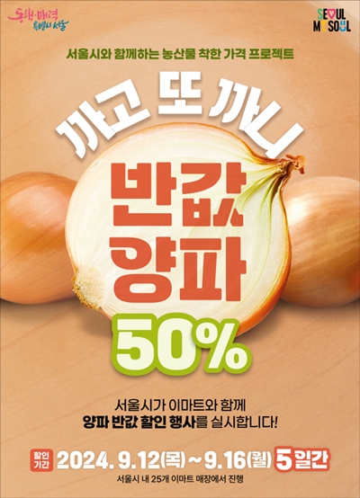 이번 행사는 추석을 앞두고 이상기온으로 폭염이 지속되고 농수산물 수요까지 가세하며 시민들의 명절 상차림 부담이 가중되는 가운데 농산물 물가안정을 위해 가격급등 품목을 선정하여 민관협력을 통해 농산물을 시중보다 저렴한 가격으로 공급하는 ‘농산물 착한가격 프로젝트’의 하나다. 할인 품목은 추석 20대 성수품< [농산물] 배추, 무, 사과, 배, 양파, 마늘, 감자 [축산물] 소고기, 돼지고기, 닭고기, 계란 [임산물] 밤, 대추, 잣 [수산물] 명태, 오징어, 고등어, 갈치, 참조기, 마른 멸치>이면서 시민들의 수요가 높고 가격상승 폭이 큰 채소류 중 양파로, 총 2만 6천 망(1망, 2.5kg)을 공급할 예정이다. 행사는 추석을 앞두고 소비자가 가장 장을 많이 보는 시기인 오는 12일(목)부터 16일(월)까지 5일간 서울 시내 이마트 25개 매장에서 양파 2.5kg 1망당 매장 정상가격 5,480원 대비 50% 할인된 2,740원에 판매한다. 시민들에게 저렴한 가격으로 농산물을 제공해 물가안정을 체감할 수 있도록 민관이 힘을 모았다. 이마트가 농산물을 확보해 할인 행사를 진행하고 서울시가 할인 금액의 일부를 지원해 원가를 낮춰 농산물을 공급하는 방식이다. 서울시는 앞으로도 시민들이 자주 구매하는 농산물 중 가격급등 또는 특정 시기 수요가 증가하는 품목을 선정해 민관과의 협력을 통해 시민들에게 저렴한 가격으로 농산물을 공급할 계획이라고 덧붙였다. 아울러 서울시는 시민들이 자주 구매하는 농산물에 대한 일일 가격 모니터링을 시행해 선제적인 물가 대응 체계를 구축 운영하는 한편, 일상생활에 밀접한 농·축·수산물, 가공식품 등 82종 품목의 가격 현황을 직접 점검하는 등 물가안정에 총력을 기울이고 있다고 밝혔다. 김경미 서울시 공정경제과장은 “이번 행사로 시민들의 추석 상차림 준비에 조금이나마 도움이 되길 바란다”라며 “앞으로도 지속적인 가격 모니터링과 함께 민관협력을 통한 농산물 착한가격 프로젝트 운영으로 장바구니 물가안정을 위해 최선을 다하겠다”라고 밝혔다.