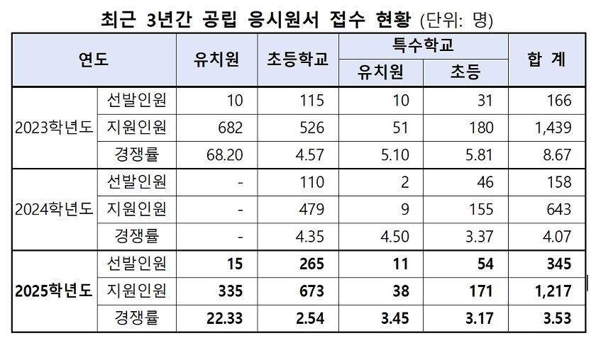 국립학교는 한국우진학교와 서울맹학교에서 위탁한 특수학교(초등) 분야에서 평균 5:1의 경쟁률을, 사립학교는 초등학교, 특수학교(유치원), 특수학교(초등학교) 분야에서 총 15명 선발에 154명이 지원하여 평균 10.27:1의 경쟁률을 나타냈다. 2025학년도 공립(국·사립) 유치원·초등학교·특수학교(유치원·초등)교사 임용 후보자 선정 경쟁시험 제1차 시험은 11월 9일(토)에 실시하며, 시험 장소 등 구체적 내용은 11월 1일 누리집을 통해 발표할 예정이다.