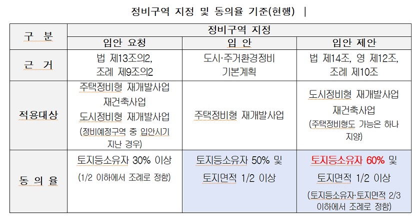 한편, 토지 등 소유자가 직접 ‘정비계획 입안 제안’ 시에는 토지 등 소유자의 60퍼센트 이상 및 토지 면적의 2분의 1 이상의 동의를 받아야 한다.