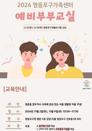 영등포구(구청장 최호권)가 11월 1일, “결혼을 앞둔 예비부부 등을 대상으로 결혼 생활에 대한 이해를 높이고, 행복한 가정생활을 지원하기 위해 ‘예비부부 교실’을 운영한다”고 밝혔다. ‘예비부부 교실’은 새로운 시작을 맞이하는 부부들에게 초기 부부 갈등을 예방하고, 안정적인 가정을 꾸리는 데 도움을 주기 위해 마련되었으며, 총 2회차로, 11월 2일과 9일 오후 1시 30분, 구청 별관 5층 강당에서 총 15쌍을 대상으로 진행된다. 2일, 1회차에는 성격유형 검사(DISC)를 통해 서로의 성격을 이해하고, 상대방의 입장을 헤아려 보는 시간을 갖고 ‘어떻게 말할까’보다는 ‘상대방을 어떻게 이해하고, 대화할까?’ 등에 초점을 맞춰 나의 감정을 표현하고, 갈등을 해결하는 소통 방법에 대해 알아본다. 9일, 2회차에는 ‘서로의 인생 곡선’을 그려보며 재무관리 등 앞으로의 구체적인 결혼 생활을 설계하는 데에 중점을 둔다. 성숙한 가정을 만들기 위한 기본 마음가짐과 함께 그려나갈 결혼생활에 대해 대화를 나누며, 결혼 후 삶에 대해 구체적으로 알아보는 시간을 갖는다. ‘예비부부 교실’은 서울 생활권 커플이거나 결혼을 앞둔 커플이라면 누구나 참여할 수 있다. 교육 참가비는 무료이며, 참여 방법은 포스터의 정보무늬(QR코드)를 통해 신청하면 된다. 2회 모두 참여한 커플에게는 교육 후에도 활용할 수 있는 워크북과 교육 수료증 등을 제공한다.