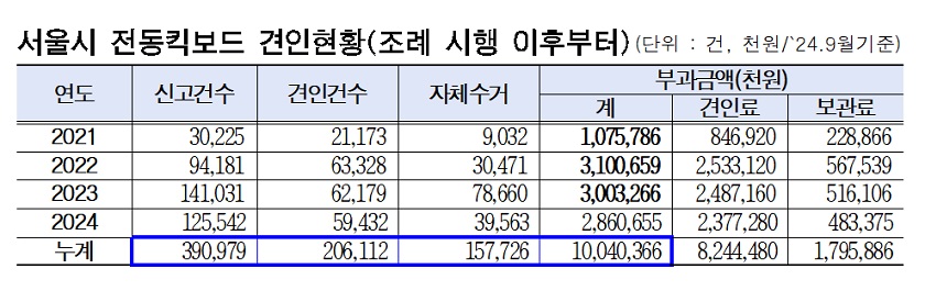 김지향 의원은 “서울시로부터 제출받은 ‘공유 전기자전거 현황’을 분석한 결과 2021년 1,600대(4개 업체)에 불과했던 서울 시내 공유 전기자전거가 2024년 9월 현재 31,742대(7개 업체)로 3년 전 대비 20배가량 증가한 것으로 나타났다”라며 이같이 주장했다. 김지향 의원은 이어 공유 전기자전거가 2022년부터 급격하게 증가한 이유로 “서울시가 2021년 전국 최초로 무단 방치된 전동킥보드의 견인을 시행했기 때문이다”라고 진단했다. 실제 전동킥보드의 견인 현황을 보면, 2021년 3만여 건에 불과한 신고 건수가 2023년 14만 1,031건으로 대폭 증가하면서 같은 기간 견인 건수도 21,173건에서 62,179건으로 늘어났다. 이에 따른 견인료 등의 부과 금액은 올해까지 총 100억 원에 달한다.