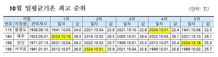 이는 작년보다 2일 빠르고, 평년보다 9일 늦은 관측이다. 한편 기상청은 이날 ‘2024년 10월 기후분석 결과’를 발표했다. 기상청 발표에 따르면 10월은 비가 내리는 날이 많았던 가운데에도 따뜻한 남풍이 자주 불고, 우리나라 주변 해역 해수면 온도가 높아 기온은 평년보다 높았다. 10월 전국 평균기온은 16.1℃로 평년(14.3℃)보다 1.8℃ 높았고, 강수량은 115.8mm로 평년(63.0mm)보다 52.8mm 더 많았다. 강수일수는 평년(5.9일)보다 5.1일 많은 11일로 역대 가장 많았다. 일본 동쪽에 위치한 고기압이 평년보다 발달하였고, 고기압 가장자리를 따라 따뜻하고 습한 남풍 계열의 바람이 우리나라로 자주 불어 평년보다 기온이 높고 강수량은 많았다. 10월 18~19일과 22일 모두 저기압이 우리나라를 통과할 때, 따뜻한 이동성고기압과 대륙고기압 사이로 통과하며 비구름이 더욱 발달하고 많은 비가 내린 가운데, 일부 지역에서는 10월 일강수량 순위가 역대 2~3위를 기록했다. 10월 우리나라 주변 해역 해수면 온도는 23.2℃로 최근 10년(2015~2024년) 평균(21.2℃)보다 2.0℃ 높았다(최근 10년 중 1위).