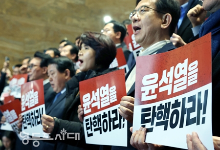 민주당은 ‘윤석열 대통령 탄핵소추안, 의결정족수 미달로 투표 불성립 후 국회 로텐더홀에서 규탄대회를 열고 표결에 불참한 국민의힘을 향해 “민주 정당이 아닌, 내란 정당, 군사 반란 정당, 주권자를 배신한 배신 정당, 범죄 정당이다”라며 “헌정 질서를 파괴하는 군사 반란 행위에, 내란 행위에 적극적으로 가담했을 뿐만 아니라 이들의 책임을 묻는 것에 대해서도 반대했다”라고 일갈했다.