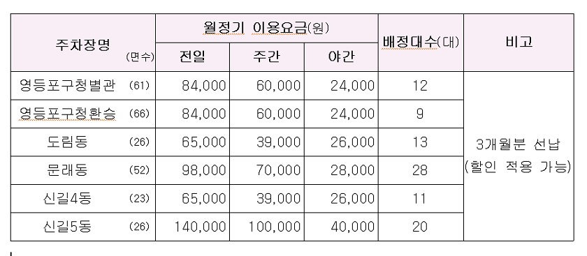 영등포구 시설관리공단은 12월 11일, 10:00부터 2025년 상반기 영등포구청환승 공영주차장 등 총 7개소 노외주차장을 대상으로 월정기 순환배정 접수를 시행한다.