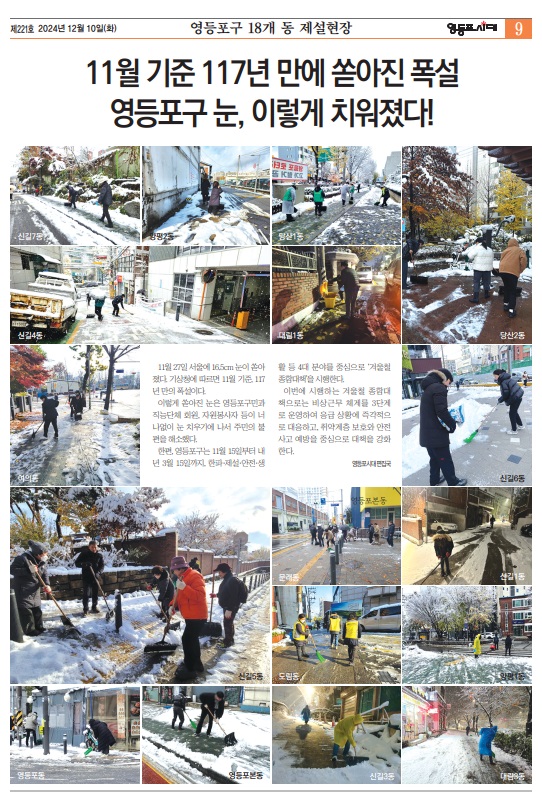 이렇게 쏟아진 눈은 영등포구민과 직능단체 회원, 자원봉사자 등이 너나없이 눈 치우기에 나서 주민의 불편을 해소했다. 한편, 영등포구는 11월 15일부터 내년 3월 15일까지, 한파‧제설‧안전‧생활 등 4대 분야를 중심으로 ‘겨울철 종합대책’을 시행한다. 이번에 시행하는 겨울철 종합대책으로는 비상근무 체계를 3단계로 운영하여 응급 상황에 즉각적으로 대응하고, 취약계층 보호와 안전사고 예방을 중심으로 대책을 강화한다.