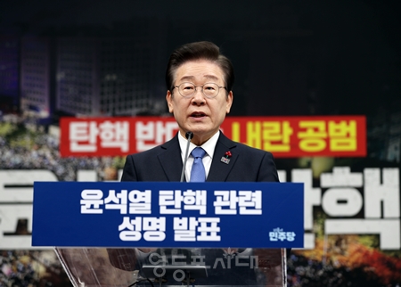 이재명 대표는 12월 13일 국회에서 발표한 성명을 통해 “잠들지 못하는 저항의 밤이 이어지고 있다”라며 “해가 뜨고 지지만 국민의 마음속에 12월 3일 악몽은 아직 끝나지 않았고, 아침이 오지 않았다”라며 이같이 강조했다. 이재명 대표는 “지금 5천만 국민은 무도하고 광기 어린 ‘내란 세력’에 맞서 자신의 평범한 일상을 회복할 장엄한 싸움을 시작했다”라며 “무뢰배가 짓밟은 우리의 민주주의를 국민 여러분께서 지켜내고 있다”라고 감사의 인사를 전했다. 이재명 대표는 이어 “어제 대통령 윤석열은 국민을 향해 광기의 ‘선전포고’를 감행했다. 추악한 거짓말로 범죄를 덮으려 했다. 한시도 직무를 수행할 능력이 없음을, 한시도 직무를 수행해서는 안 됨을 ‘셀프 인증’했다”라고 주장했다. 이재명 대표는 “국민의 명령은 ‘내란수괴’ 윤석열은 지금 당장 물러나라는 것, 단 1분 1초도 국민을 섬기는 1호 머슴 대통령의 자리에 앉아 있어선 안 된다는 것이다”라며 “민주당은 그 준엄한 명령에 따라 내일 대통령 탄핵소추안 두 번째 표결에 돌입한다”라고 밝혔다.