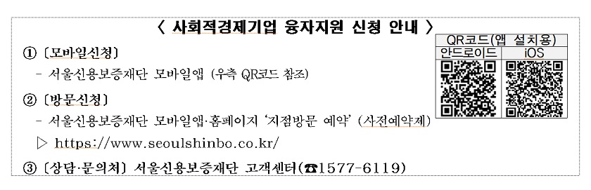 과거 서울시 중소기업육성기금 사회적경제계정(구. 사회투자기금) 융자 수행기관을 통해 지원받고 상환 중인 경우는 신청일 기준의 대출잔액을 차감한 범위 내에서 신규 대출이 가능하다. 기업당 융자 금액과 지원 대상 여부는 서울신용보증재단에서 기업 신용도 판단 정보, 국세·지방세 체납 여부 등 내부 평가 기준에 따라 심사를 거친 후 최종 결정된다. 융자금은 1년 거치 4년 원금균등분할 상환 조건으로 지원된다. 신청은 14일(화)부터 서울신용보증재단 모바일앱을 통해 방문 없이 비대면으로 가능하다. 비대면 신청이 어려운 경우, 모바일앱 또는 서울신용보증재단 누리집에서 ‘지점방문 예약 신청’을 통해 예약 후 해당 날짜에 지점을 방문 신청하면 된다. 신청 기한은 연내 자금 소진 시까지며, 관련 상담 및 문의는 서울신용보증재단 고객센터로 하면 된다. 서울신용보증재단 영등포지점은 서울시 영등포구 경인로 775(문래동3가 55-20) 에이스하이테크시티 4동 301호, 문래역(2호선) 7번 출구 방향에 있다. 상담은 서울신용보증재단 고객센터(1577-6119)로 하면 된다.
