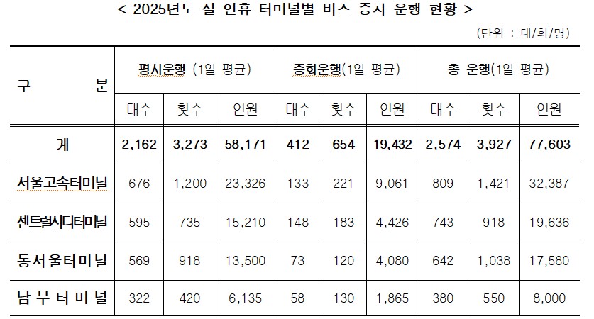 서울시는 1월 15일 시민들의 귀성·귀경길 지원을 위해 ‘2025년 설 연휴 대비 터미널 운영 계획’을 마련하고 연휴 기간 버스 운행 증차 및 시설물 관리 대책을 수립했다고 밝혔다. 시는 서울고속터미널, 센트럴시티터미널, 동서울터미널, 서울남부터미널에서 연휴 전인 1월 24일)부터 2월 3일)까지 11일간 증편 운행을 실시한다.