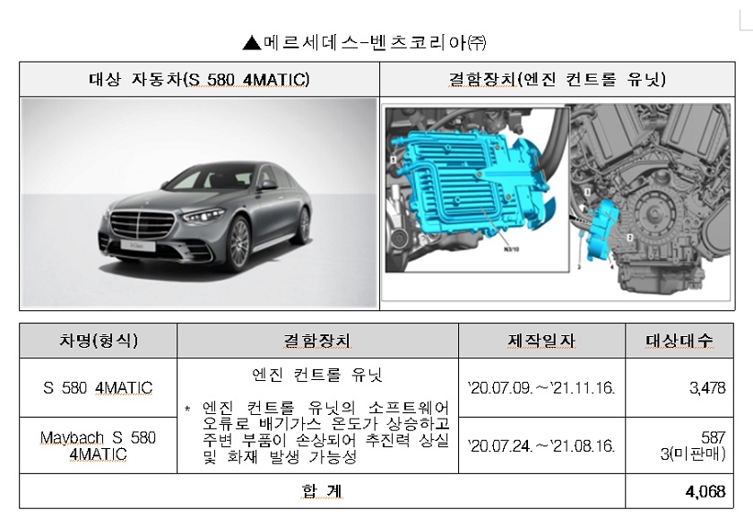 벤츠는 ▶S 580 4MATIC 등 2개 차종 4,068대는 엔진 컨트롤 유닛 소프트웨어 오류로 1월 16일부터 시정조치를 진행하고 있다. 테슬라는 ▶모델Y 등 2개 차종 2,425대는 타이어 공기압 모니터링 시스템 소프트웨어 오류로 인해 타이어 공기압 경고 장치가 정상 작동되지 않는 안전기준 부적합으로 1월 14일부터 시정조치를 진행하고 있다. 한편, 내 차의 리콜 대상 여부와 구체적인 결함 사항은 자동차리콜센터(PC www.car.go.kr, 모바일 m.car.go.kr/문의처 080-357-2500)에서 차량번호 및 차대번호를 입력하고 확인할 수 있다.