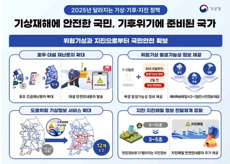 기상청(청장 장동언)은 2025년 정책목표를 ‘기상재해에 안전한 국민, 기후 위기에 준비된 국가’로 정하고, 갈수록 심해지는 기후 위기와 이상기상에 대응하기 위한 주요 정책 추진계획을 1월 22일 발표했다. 기상청이 이날 발표한 기후 위기 대응 주요 정책으로는 ▲호우·대설 재난 문자 확대 ▲폭염 등 위험 기상 발생 가능성 사전 정보 신규 제공 ▲도로 위험 기상정보 서비스 확대 ▲지진·지진해일 정보 전달체계 강화 ▲후 예측 정보 제공 강화 ▲기후변화 상황지도를 통한 기후변화 과학정보 확대 ▲국가 기후변화 표준 시나리오 생산 및 활용 기반 구축 ▲인공지능(AI) 기상예측 등 미래기술개발 ▲기상산업 지원 강화 등이다. 장동언 기상청장은 “기상재해로부터 국민 생명과 안전을 최우선으로 지키기 위해 신속하고 가치 있는 기상정보를 적극 제공할 계획이다”라며 “인공지능 기술 등을 본격 활용하여 기후 위기로부터 미래를 준비하도록 최선을 다하겠다.”라고 밝혔다.
