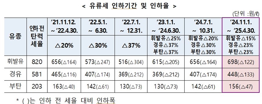 현재 유류세는 인하 전 탄력세율을 적용해 리터(ℓ)당 휘발유는 698원, 경유 448원, 부탄 156원이다.
