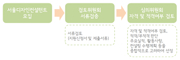 서울디자인컨설턴트 선정은 모집된 각 디자인분야의 전문가들을 검토위원회에서 제출서류에 대한 철저한 검증을 거쳐 디자인계 원로들로 구성된 심의위원회에서 지원자 개개인의 주요실적, 활동사항, 컨설팅 수행능력 등을 종합적으로 심사하여 최종 선정하였다.