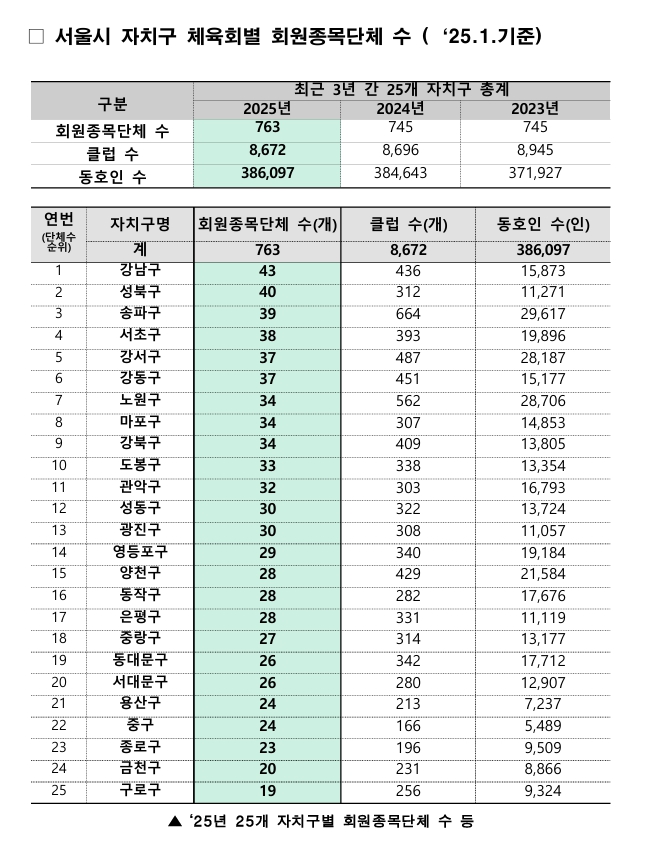 2025년 25개 자치구별 체육회 생활체육 종목별 단체 수(763곳)를 살펴보면, 종목별 단체 현황(123곳)의 경우, 2024년(114곳) 종목 대비 1년 사이에 9개의 종목 단체가 증가했다.