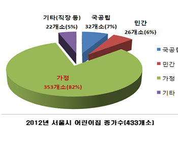 「2012년 말 서울시 보육통계」에 따르면, 무상보육을 실시한 작년 서울의 어린이집 시설수를 비롯해 어린이집 종사자, 어린이집 정원 및 이용아동이 모두 증가한 것으로 나타났다.