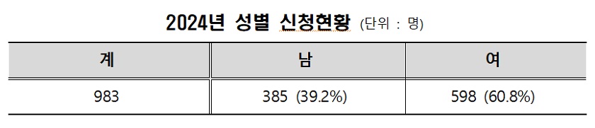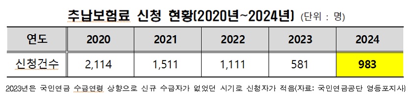 2024년 영등포구의 국민연금 ‘추후납부’ 신청자가 983명으로 집계됐다. 이 중 여성이 598명(60.8%), 남성이 385명(39.2%)으로 여성이 남성보다 1.6배 정도로 많은 것으로 파악됐다. 특히, 예전에 직장 생활을 하다가 그만둔 50~60대 경력 단절 주부의 추납 신청이 두드러지게 나타났다. 나이별로는 60대 이상 457명(46.5%), 50대 374명(38.0%)으로 50~60대가 84.5%로 높은 비중을 차지했다. 2025년 1월에도 신청자 69명 중 여성이 45명으로 65.2%를 차지했다.