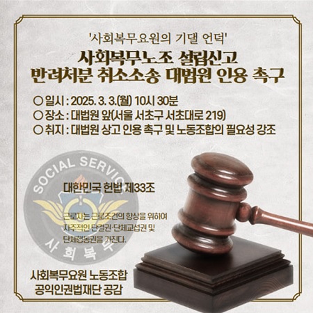 두 단체에 따르면 ‘복무 기관 내 괴롭힘 금지법’이 제정되었지만, 여전히 병역 이행 과정에서 어려움을 겪는 사회복무요원 많아 사회복무노조에만 월평균 20회가량 상담 요청이 들어온다. 6만 명의 사회복무요원을 대변할 수 있는 노동조합이 필요한 이유다. 이에 사회복무요원 노동조합과 공익인권법재단 공감은 이날 기자회견에서는 소송대리인인 공감의 천지선 변호사가 대법원 상고 취지를 설명하고, 사회복무요원 노동조합의 김무성 대의원이 철도기관에 대한 단체교섭 및 단체협약(안) 내용을 발표한다. 이어서 사회복무요원 노동조합의 하은성 위원장의 ‘복무 기관 내 괴롭힘 금지법’ 시행 이후 2024년 하반기 노동조합 상담통계와 피해사례를 발표하고 복무 기관에서 공무상 질병 피해를 받았음에도, 남양주시의 질병 불인정 처분 때문에 행정소송을 해야만 했던 사회복무요원의 아버님이 노동조합의 필요성을 이야기할 예정이다. 사회복무요원 노동조합과 공익인권법재단 공감은 “노동으로 인정받지 못하는 노동의 문제는 사회복무요원만의 문제가 아니다”라고 강조했다.