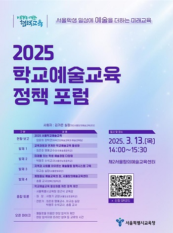 서울시교육청은 “3월 13일(목) 제2 서울 창의 예술교육센터에서 ‘서울 학생 일상에 예술을 더하는 미래 교육’을 주제로 ‘2025 학교 예술교육 정책 포럼’을 개최한다”고 3월 11일 밝혔다. 이날 진행될 프로그램으로는 ▲임윤희 체육 건강 예술교육과 예술교육팀 장학관의 ‘2025 서울학교 예술교육 현황 보고’ ▲최준호 한국예술종합학교 명예교수의 ‘교육과정과 연계한 학교 예술교육 활성화-협력 종합 예술 활동 사례 공유’ ▲박행주 서울 언남초등학교 수석교사의 ‘미래를 잇는 학생 예술 경험 다양화-전통과 미래를 잇는 국악 교육 운영 지원 제안’ ▲이규승 서울문화재단 실장의 ‘지역과 사회를 아우르는 예술 활동 협력 시스템 구축-학교 밖 자원의 교육적 연계 및 활용’ ▲송흠 경복고등학교 교사(제3 서울 창의 예술교육센터 파견 교사)의 ‘체험 중심 예술교육의 장, 서울 창의 예술교육센터-다양한 빛깔의 예술 성장 놀이터 서울 창의 예술교육센터 프로그램’을 내용으로 발제한다. ‘학교예술교육 활성화를 위한 정책 제안’을 위해 정근식 서울시 교육감을 좌장으로 서형기 교장(서울 도성초등학교), 전문가로 최준호 명예교수와 이규승 실장, 박행주 수석교사와 송흠 교사가 패널로 참여하며 패들렛을 이용하여 현장 참석자들과 활기차게 소통하며 종합 토론을 진행한다. 정근식 서울시 교육감은 “이번 포럼을 계기로 학교 현장과 유관기관을 긴밀하게 연계하여 서울 학생이 예술과 함께 생활하고 예술과 함께 성장하는 예술 향유인으로 자라날 수 있도록 계속해서 지원할 것이다.”라고 밝혔다.