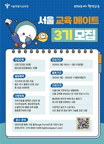 서울시교육청은 3월 18일, “시민의 편에서 다양한 주제와 형식으로 서울교육의 정책과 정보를 개성 있게 제작하여 확산하기 위해 서울교육메이트 3기를 모집한다”고 밝혔다. 만 18세 이상의 서울 생활권자로 본인의 소셜미디어, 블로그 등을 운영하며, 영상 제작이 가능하고 SNS 활용에 능통한 사람 등 누구나 지원할 수 있다. 2023년 20명으로 시작된 서울교육메이트는 다양한 형식의 콘텐츠 제작을 통해 시민들과의 소통을 활발히 하며 서울교육 정책의 이해도와 관심도를 높이는 데 기여했다. 서울교육메이트 3기의 모집인원은 2기와 동일한 60명이며, 소셜미디어 기자단 50명, 미디어 크리에이터 10명으로 구성된다. 선정된 60명의 서울교육메이트 3기는 4월 초 발대식을 시작으로 2025년 11월까지 8개월간 활동할 예정이며, 서울교육정책과 정보 관련 콘텐츠를 제작 및 확산하는 등 서울교육과 시민의 가교역할을 담당한다. 서울교육메이트 3기 참여를 원하는 지원자는 3월 31일(월)까지 서울시교육청 공식 블로그에 방문해 구글폼즈로 지원서를 작성 및 접수하면 된다. 정근식 서울시 교육감은 “평범한 서울 시민으로 구성된 서울교육메이트는 2년 동안 시민들과의 적극적인 소통을 통해 서울교육을 아주 특별하게 만들고 있다”며 “시민들의 적극적인 지원으로 특별한 서울교육 이야기를 함께 만들어 가자”고 말했다.