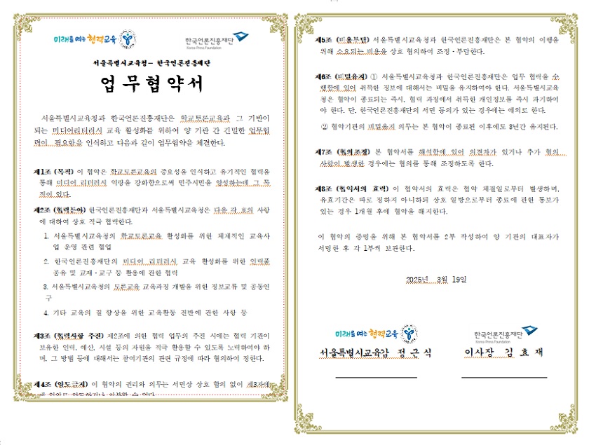 서울특별시교육청(교육감 정근식)은 3월 19일(수), 서울프레스센터에서 한국언론진흥재단(이사장 김효재)과 신의와 협력을 바탕으로 학교 토론 교육의 중요성을 인식하고, 그 기반이 되는 미디어 리터러시 역량을 강화함으로써 올바른 민주시민을 양성하기 위해 업무협약을 체결했다. 이날 협약식에는 서울시 교육감, 한국언론진흥재단 이사장, 서울시교육청과 재단 관계자 등 12명 내외가 참석했다.