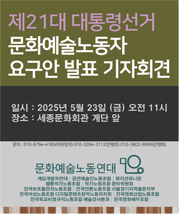 문화예술노동연대는 21대 대통령 선거를 앞두고5월 23일 오전 11시 서울 세종문화회관 계단 앞에서 문화예술노동자 대선 요구안 발표 기자회견을 개최한다고 22일 밝혔다.