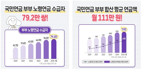 국민연금공단 영등포지사는 “올해 1월말 기준 국민연금의 대표 급여인 노령연금을 함께 받는 부부는 79만2,000쌍에 달하고, 부부 합산 노령연금액은 월 평균 111만원이다”라고 5월 27일 밝혔다. 국민연금공단 영등포지사에 따르면 국민연금은 개인별로 가입하는 사회보험이다. 부부가 모두 국민연금에 가입해 각자 10년 이상 연금보험료를 납부했을 때는 부부 모두 자신의 연금을 받을 수 있다. 2025년 1월말 노령연금을 함께 받는 부부는 79만2,000쌍으로, 2020년말 대비 1.9배가 증가했다. 부부 합산 평균 연금액도 월 111만원으로 2020년 81만원에서 증가세를 보이고 있다. 또한 국민연금 월 합산 300만원 이상을 받는 부부 연금수급자는 2017년 3쌍에서 2025년 1월말 기준 3,236쌍으로 늘었다. 국민연금 부부 합산 최고 연금액은 543만원이며, 최고 연금액을 받는 부부 각각의 연금액은 남편 260만원, 아내 283만원이다. 박종필 국민연금공단 영등포지사장은 “현재 노령연금 수급자 중 약 27%가 부부 수급자”라며 “부부가 함께 국민연금에 가입하고 2배로 든든한 노후를 준비할 수 있다”고 말했다.
