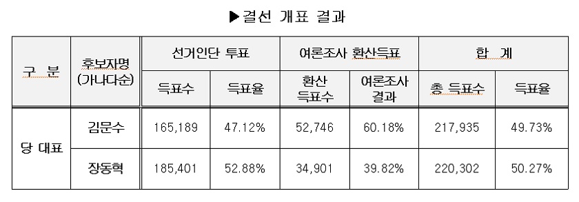국민의힘은 8월 22일 오전 국회도서관에서 제 제6차 전당대회 당 대표 선거 결선투표를 시행한 결과 장동혁 후보가 220,302표(50.27%)를 득표해 217,935표(49.73%)를 얻은 김문수 후보를 2,367표 (0.54%P)차로 누르고 당선됐다. 국민의힘 관계자는 “득표율은 소수 셋째 자리에서 반올림되었다”라고 밝혔다.