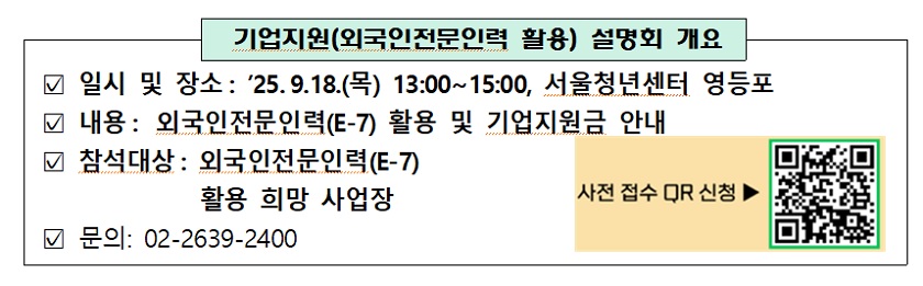 서울남부고용노동지청은 “중소벤처기업진흥공단·대한행정사회·청년센터와 협업하여 9월 18일 외국인 전문 인력(E-7-1) 활용 방안에 대한 설명회를 개최한다”고 9월 10일 밝혔다.