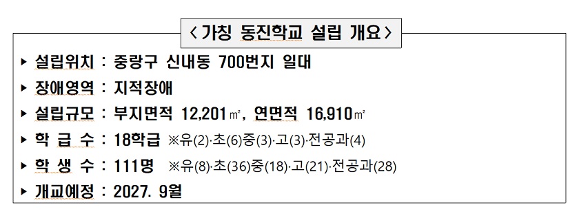 (가칭)동진학교는 2012년 설립계획을 시작으로 9차례 후보지 검토를 거쳐, 2019년 현재 부지(중랑구 신내동 700번지 일대, 개발제한구역)로 최종 결정됐다.
