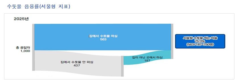 올해 조사 결과, 수돗물을 ‘먹는 물’로 이용한다는 응답이 75%로, 지난해(69.6%)보다 5.4%p 늘었다. 서울시민 10명 중 7명 이상이 수돗물을 마시고 있는 셈으로, 수돗물 음용 문화가 일상 속에서 점차 정착되고 있는 것으로 풀이된다.
