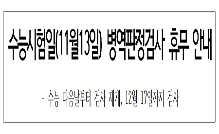 서울지방병무청(청장 김용무)은 “대학수학능력시험이 실시되는 11월 13일(목)에는 병역판정검사를 실시하지 않는다”라고 11월 12일 밝혔다.