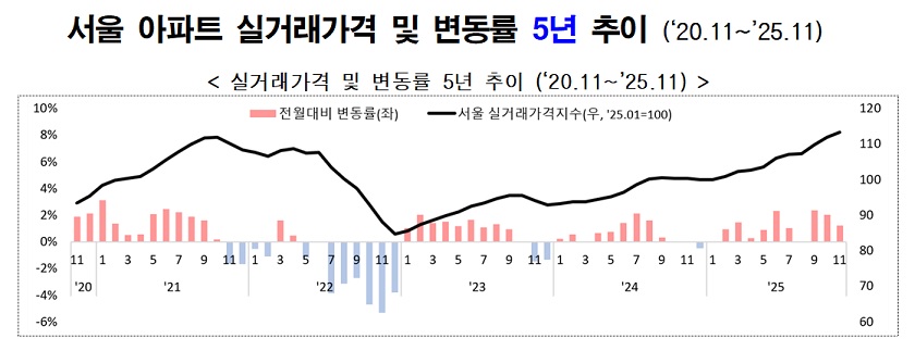 한편, 11월 아파트 전세 실거래가는 서울 내 5개 생활권역에서 모두 상승하며 서울 전체 기준 0.94% 올랐다. 이 중 서남권이 전월 대비 1.09%로 가장 높은 상승률을 보였다. 규모별로는 중소형(전용면적 60㎡ 초과 85㎡ 이하)이 1.16%로 가장 높은 상승률을 보였다. 서울시는 실거래가를 기반으로 생활권, 규모, 건축 연한 등 다각적으로 시장 동향을 분석해 ‘서울주택 정보마당’에 매월 말 공개할 예정이다. 최진석 주택실장은 “부동산 시장의 과도한 불안이나 막연한 기대를 완화하고 시민들이 합리적인 결정을 할 수 있도록 실거래 기반의 정확한 시장 정보를 지속적으로 제공하겠다”라고 말했다.