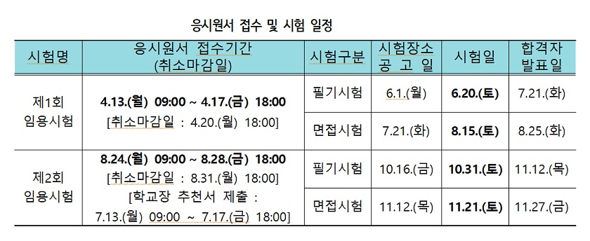 제1회 공개경쟁 및 경력 경쟁 임용시험(469명) 응시원서는 4월 13일(월)부터 4월 17일(금)까지 온라인 교직원 채용사이트에서 접수할 예정이며, 필기시험은 6월 20일(토) 시행 후 7월 21일(화) 합격자를 발표할 예정이다. 제2회 경력 경쟁 임용시험(12명)은 기술계고등학교 졸업(예정)자를 대상으로 시행하며, 7월 13일(월)부터 7월 17일(금) 까지 학교장 추천서를 받은 후 8월 24일(월)부터 8월 28일(금)까지 온라인 교직원 채용사이트에서 응시원서를 접수할 예정이다. 필기시험은 10월 31일(토) 시행 후 11월 12일(목) 합격자를 발표할 예정이다.