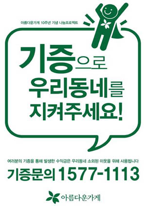 또한 이번 캠페인을 위해 특별 제작된 기증 봉투를 시민들에게 나눠줄 계획이다. 기증 참여를 원하는 사람은 물품을 봉투에 담아 가까운 아름다운가게 매장에 전달하면 된다. 이 밖에도 지역별 각 매장의 인근 기업 및 단체들 역시 이번 특별 캠페인을 위해 기증품을 내놓는다. 한편 오는 26일과 27일에는 아름다운가게 전국 매장에서 캠페인을 통해 기증된 물품을 판매하는 ‘아름다운 하루’가 개최된다. 이번 ‘아름다운 하루’는 평소 필요했던 물품을 저렴하게 구매하면서, ‘우리 동네’도 도울 수 있는 뜻 깊은 나눔의 장이 될 것으로 기대를 모으고 있다. 아름다운가게 홍명희 이사장은 “아름다운가게가 창립 10주년을 맞이해 시민 여러분들과 함께하는 나눔의 장을 마련했다”며 “많은 분들이 참여해 주셔서 더 많은 우리 이웃들이 함께 웃을 수 있게 되길 바란다”고 덧붙였다.